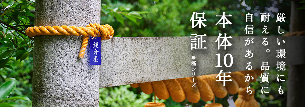 ポリエチレンを使用した極(きわみ)シリーズのしめ縄(本体)は10年保証。納品から10年以内に使用できなくなった場合は無償で修理・交換いたします。